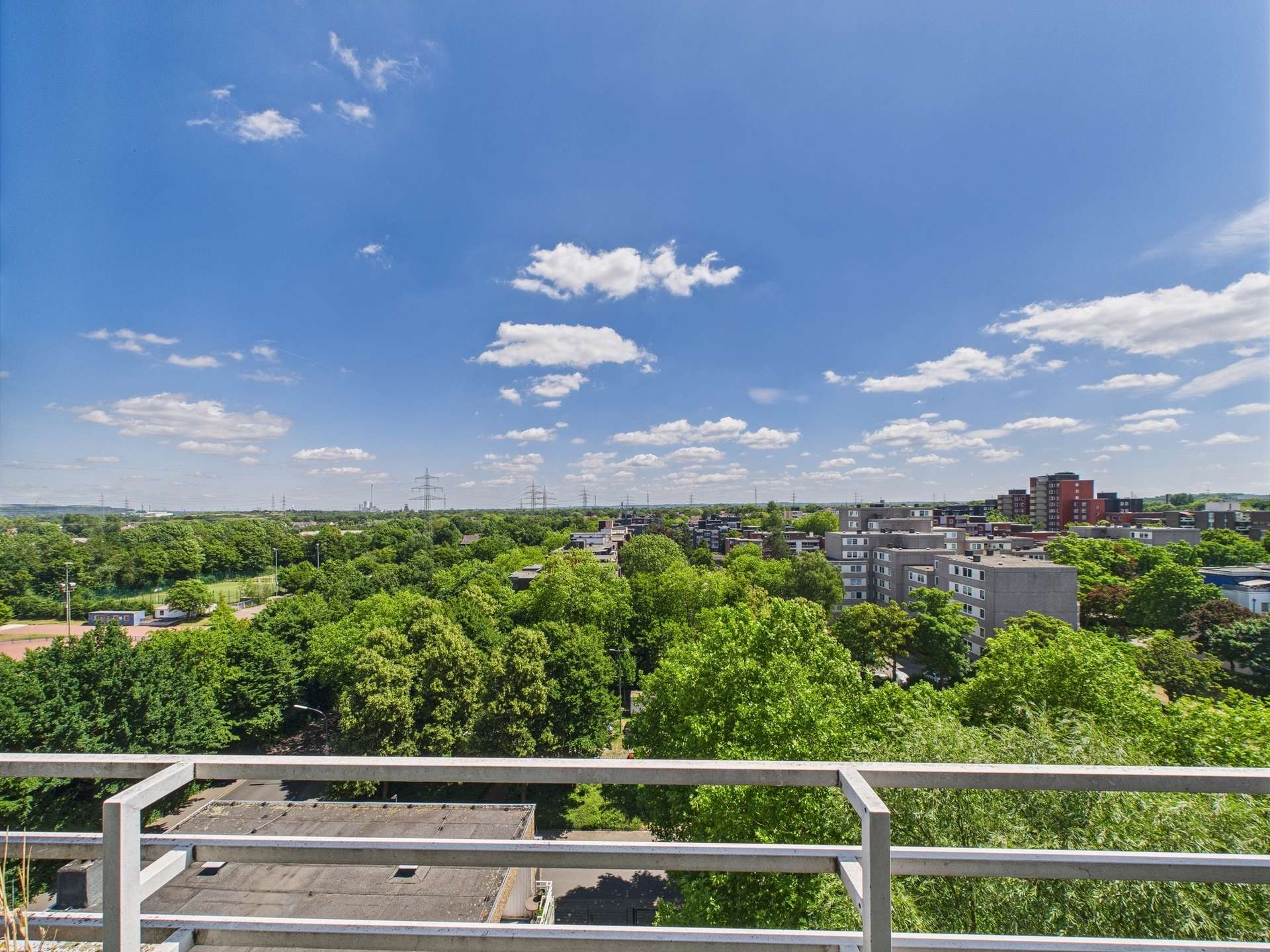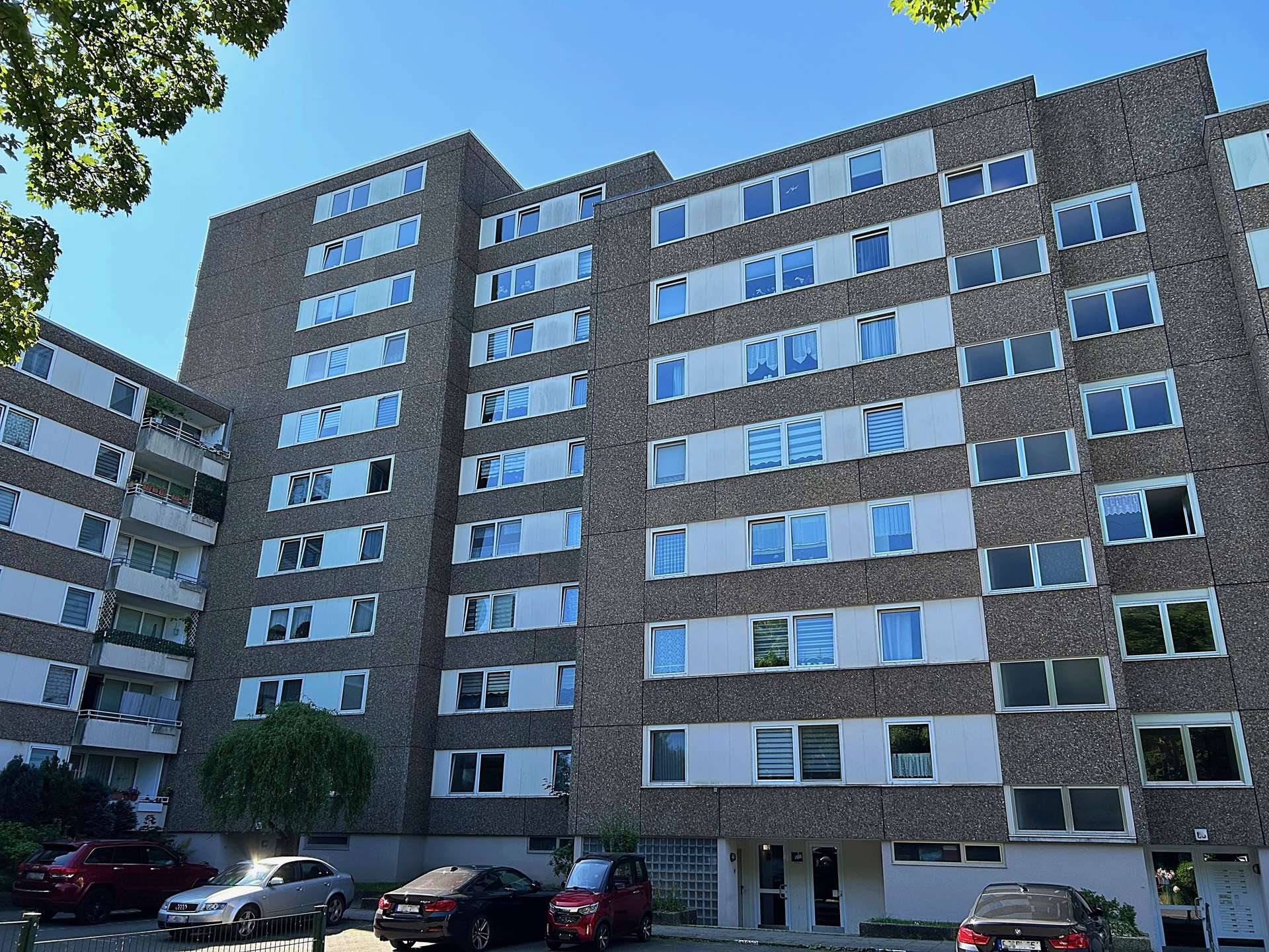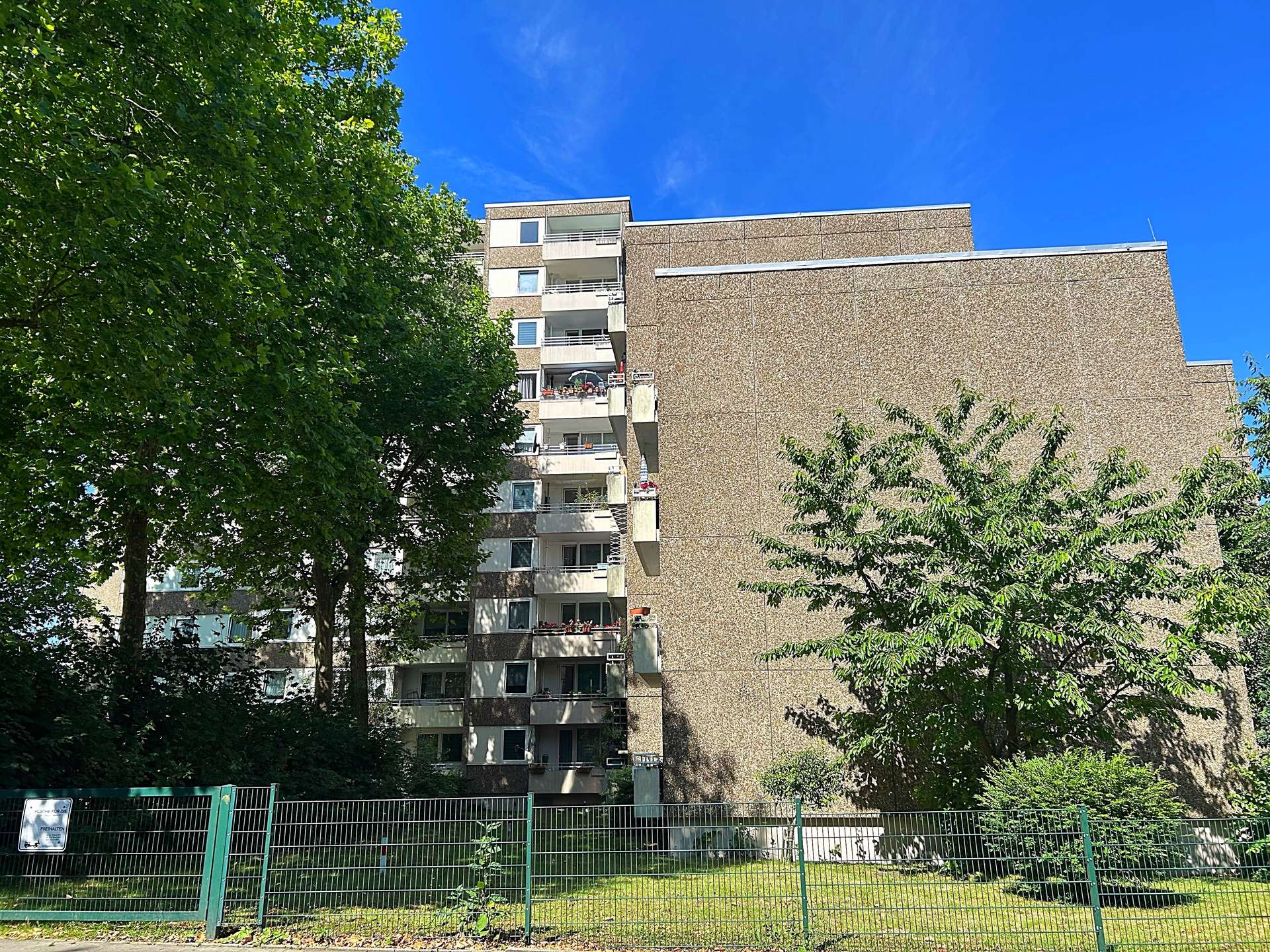 Diese 3-Zimmer-Wohnung befindet sich im 9. Obergeschoss einer ruhigen Wohnanlage. Zu erreichen ist die Wohnung über einen Fahrstuhl bis zum 8. Obergeschoss und dann ein Stockwerk über das Treppenhaus. Die Wohnanlage besteht aus 4 Gebäuden mit insgesamt 96 Eigentumswohnungen. Die Anlage wurde 1975 auf einem 6.677 m² großen Grundstück errichtet und verfügt über begrünte Außenanlagen mit vielen Spielmöglichkeiten für Kinder.